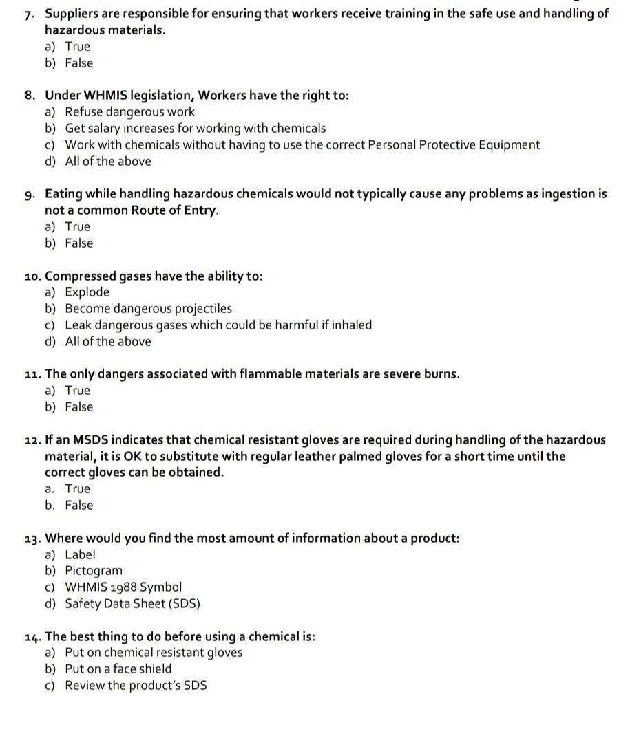 How many hazard pictograms are there in Whmis? - TimesMojo The nine hazard classes are as follows: Class 1: Explosives. Class 2: Gases. Class 3: Flammable and Combustible Liquids. Class 4: Flammable Solids. Class 5: Oxidizing Substances, Organic Peroxides. Class 6: Toxic Substances and Infectious Substances. Class 7: Radioactive Materials. Class 8: Corrosives. What are the 3 signal words? How many types labels are required by whmis legislation? - Answers What are the 2 types of whmis labels? Workplace and consumer label 10 Types of WHMIS Labels and Their Symbol Meanings Here are the ten different types of WHMIS labels and their symbol meanings: Type #1: Flame symbols. You may recognize this common safety symbol, which features a flame and a line underneath it. This WHMIS label's meaning indicates that the product is a potential fire hazard, meaning that it can ignite easily. The item may also combust rapidly if not stored and handled with care. WHMIS 2015: Hazardous Products Regulations requirements - Canada.ca The Information Elements Required on a WHMIS 2015 SDS and the Information Elements Required on a WHMIS 2015 label provide guidance on the requirements for SDSs and labels under the HPR. ... maintain the current level of protections afforded to Canadian workers or to respect the framework of the Canadian legislation and regulations. Through the ...